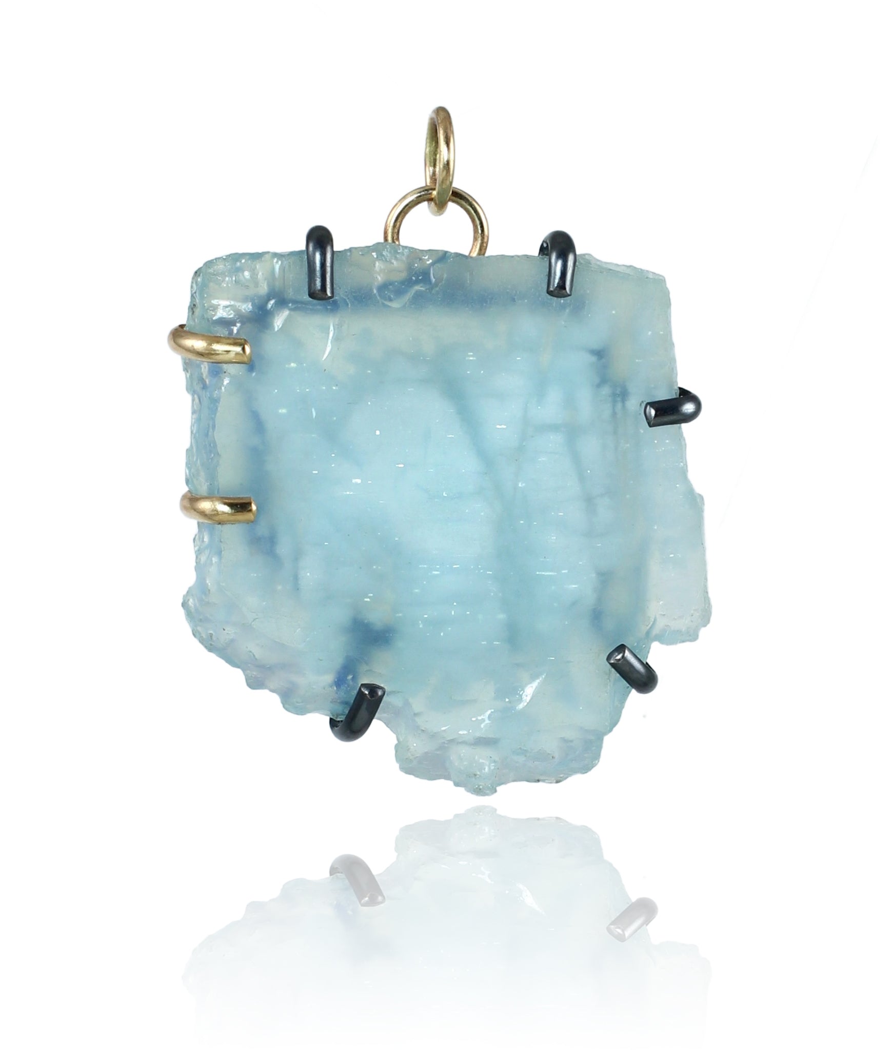 • Natural large aquamarine slice with beautiful internal "clouds". Held in a mix of recycled 14k gold and oxidized sterling silver prongs. Hand waxed to preserve and deepen the oxidized finish.
